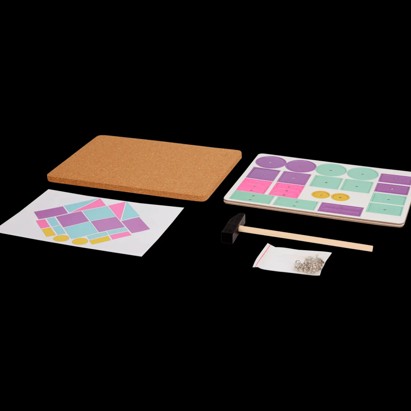 Met dit Hamertje Tik spel maakt je kind zelf mooie en kleurrijke creaties door de gekleurde vlakken op de plaat vast te spijkeren.