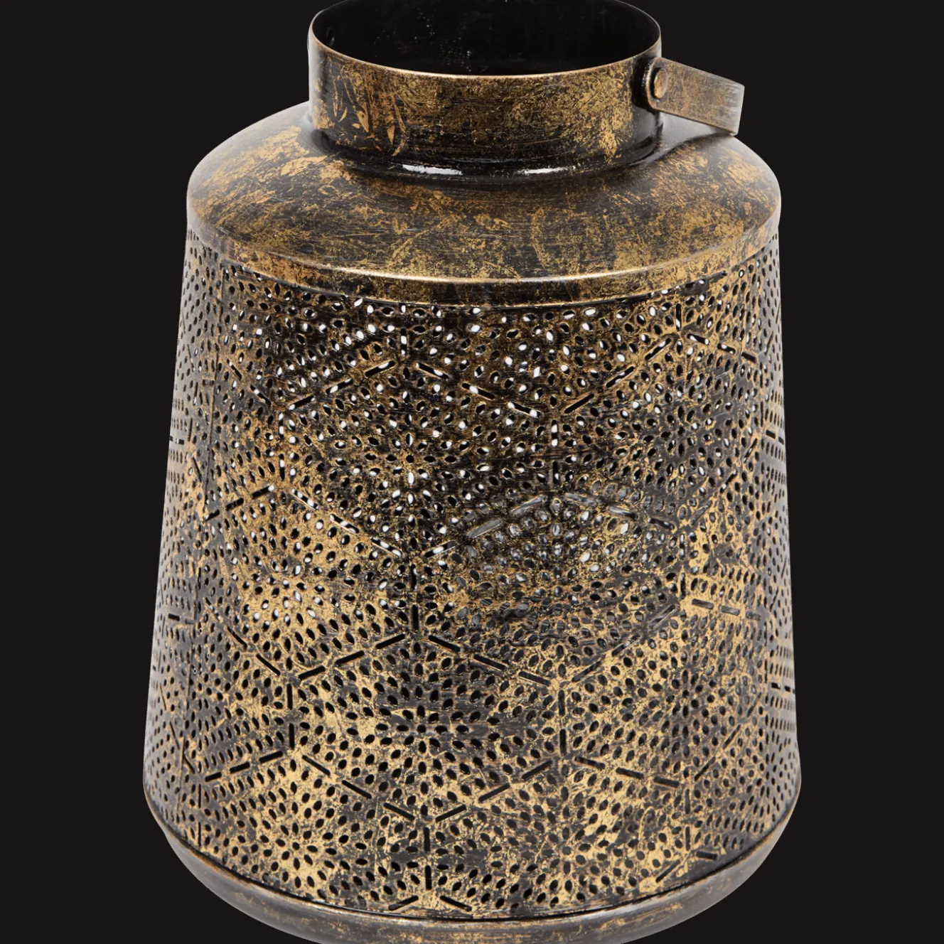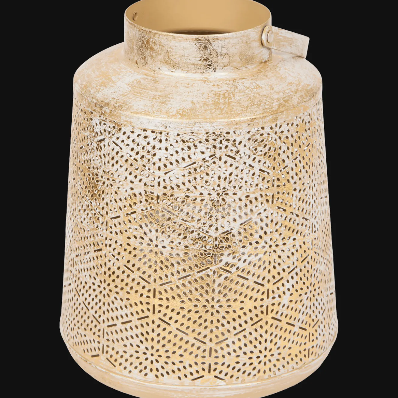 Metalen windlicht met een mooi patroon dat een vintage uitstraling geeft. Met het handvat verplaats je hem makkelijk.