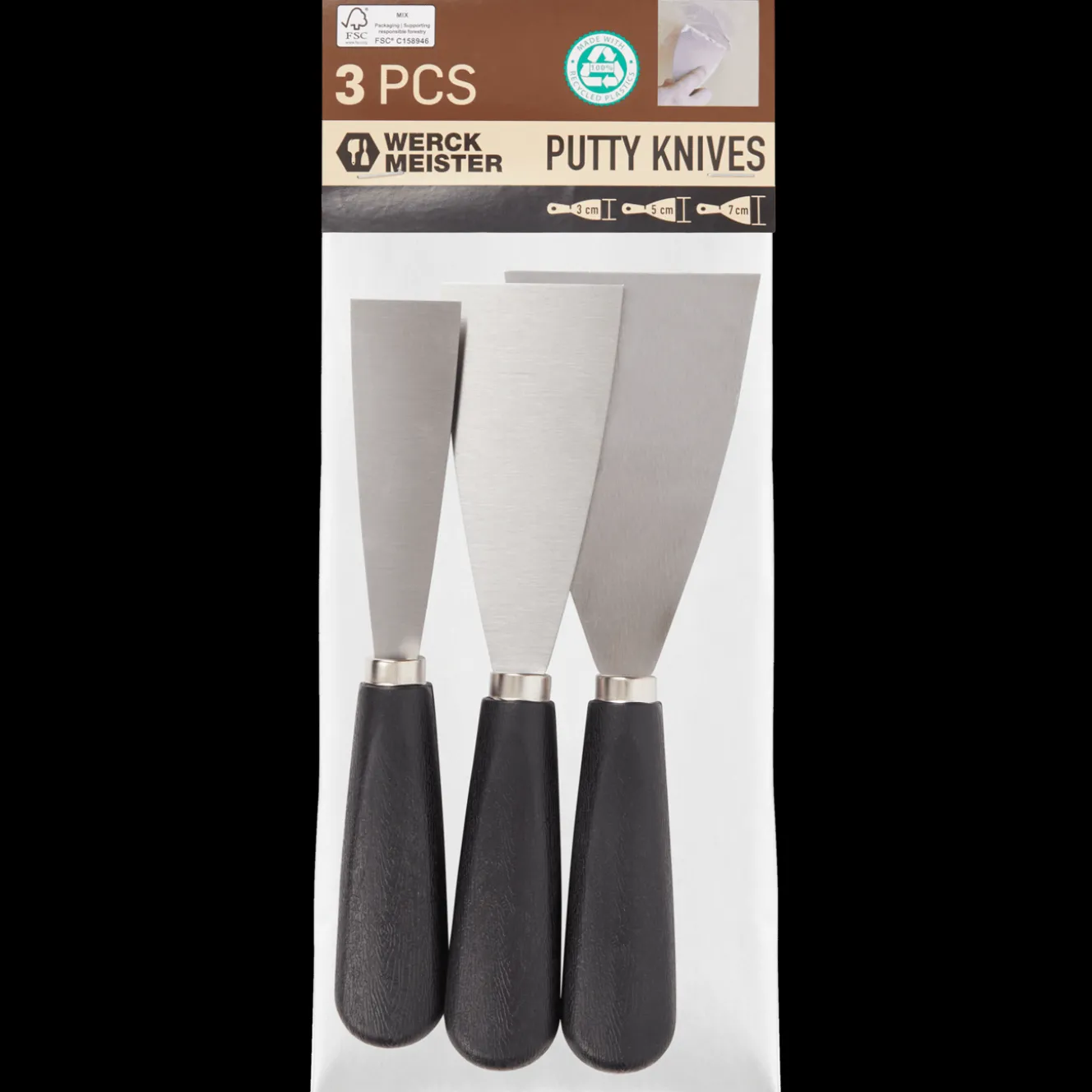 Licht-verend plamuurmes in verschillende breedtes. Ideaal om gaten in hout of de muur af te vlakken of te vullen.