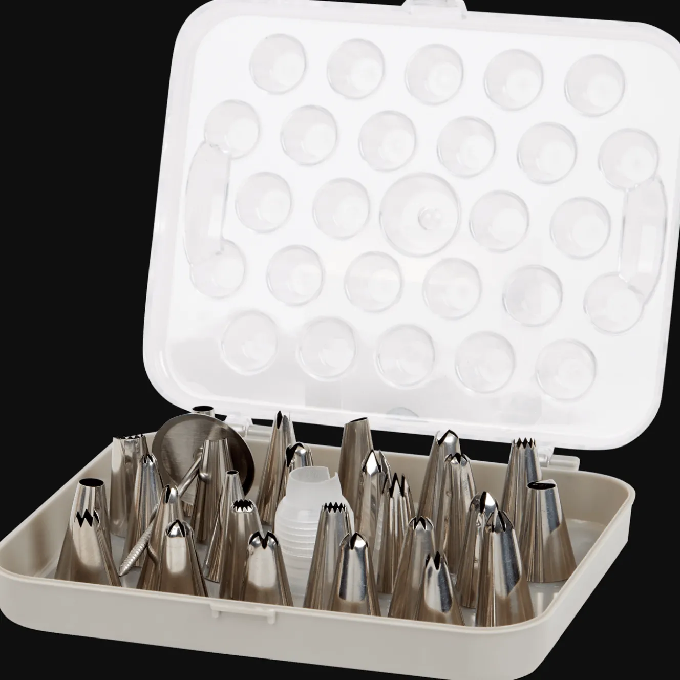 Geef al je taarten en cupcakes unieke decoraties met deze set met 26 spuitmonden. Maak mooie randjes, grote toefen of zelfs bloemetjes met deze uitgebreide kit. Je bergt ze makkelijk weer op in de handige bewaarbox.