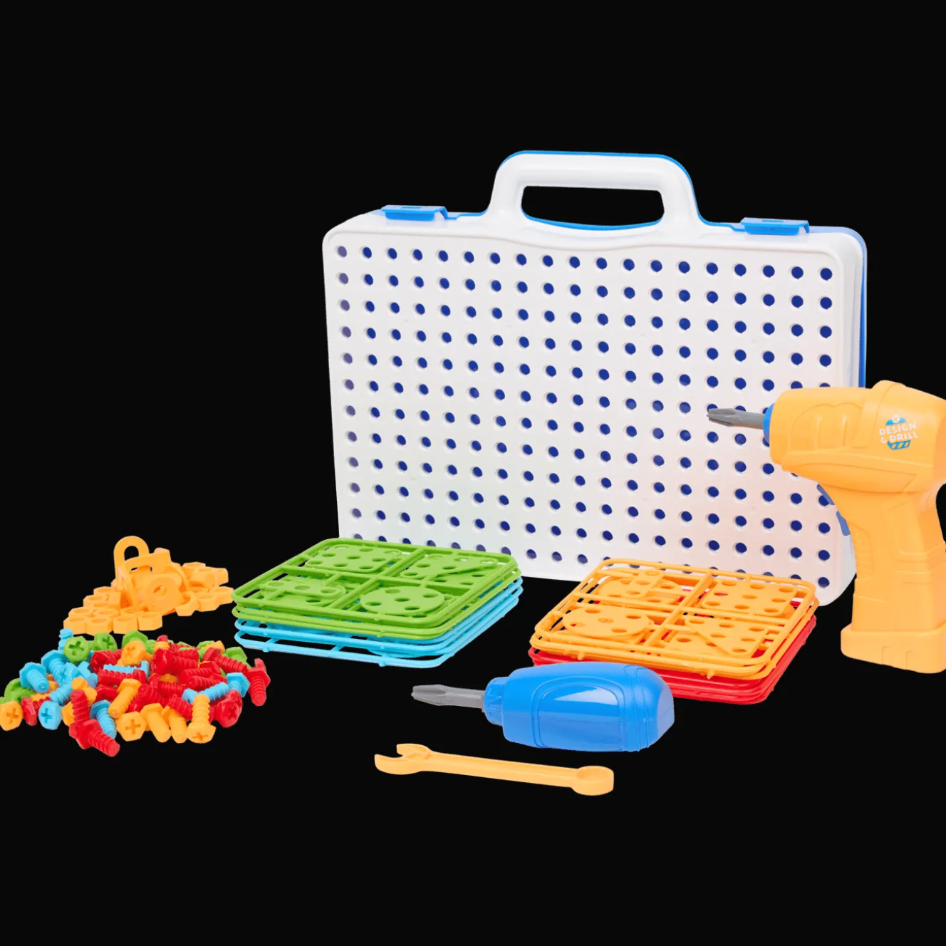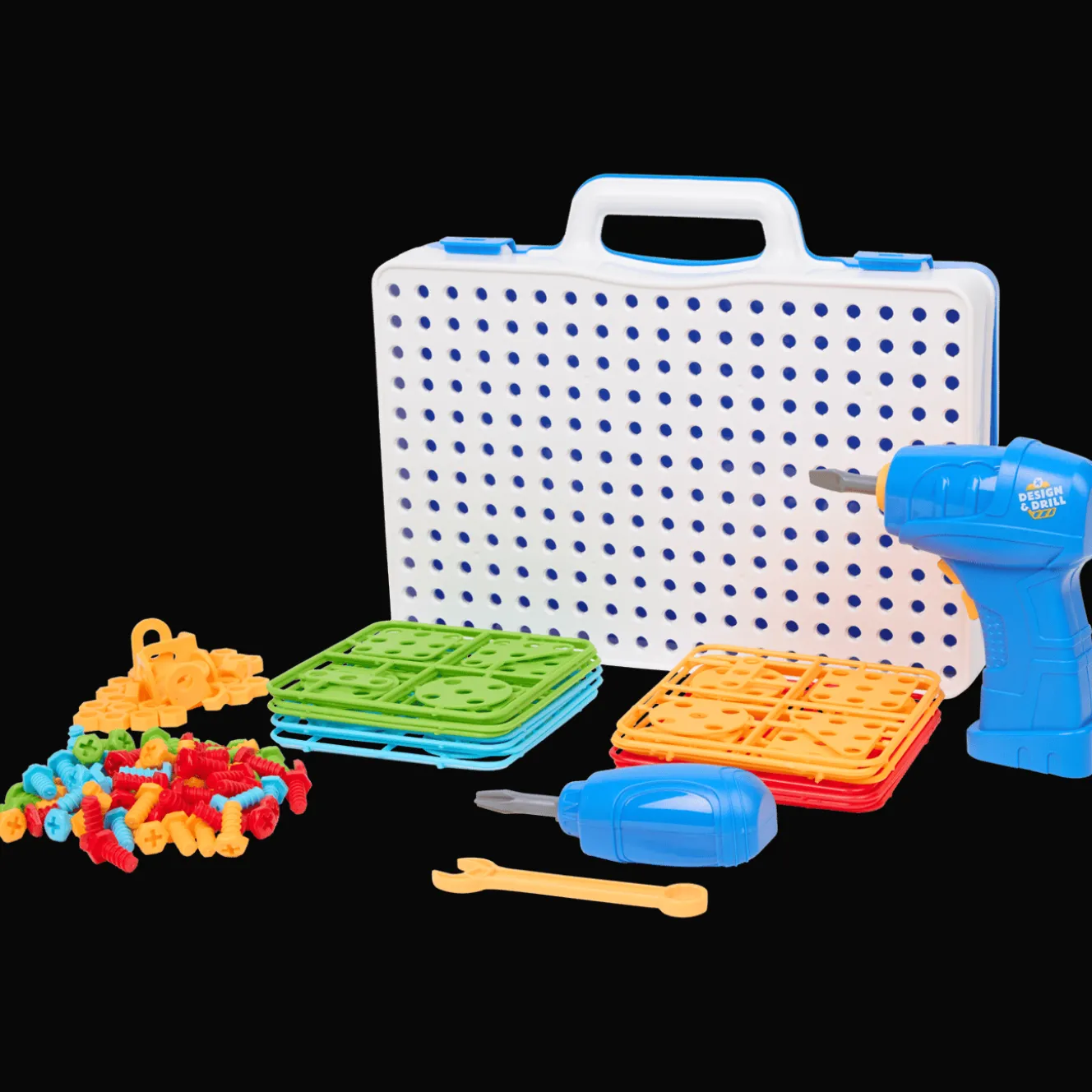 Met deze kluskoffer maak je veilig de vetste ontwerpen. Gebruik het gereedschap en de elektrische schroevendraaier, wees creatief en bevestig je creaties aan de handige koffer. Batterijen voor de schroevendraaier zijn apart verkrijgbaar.