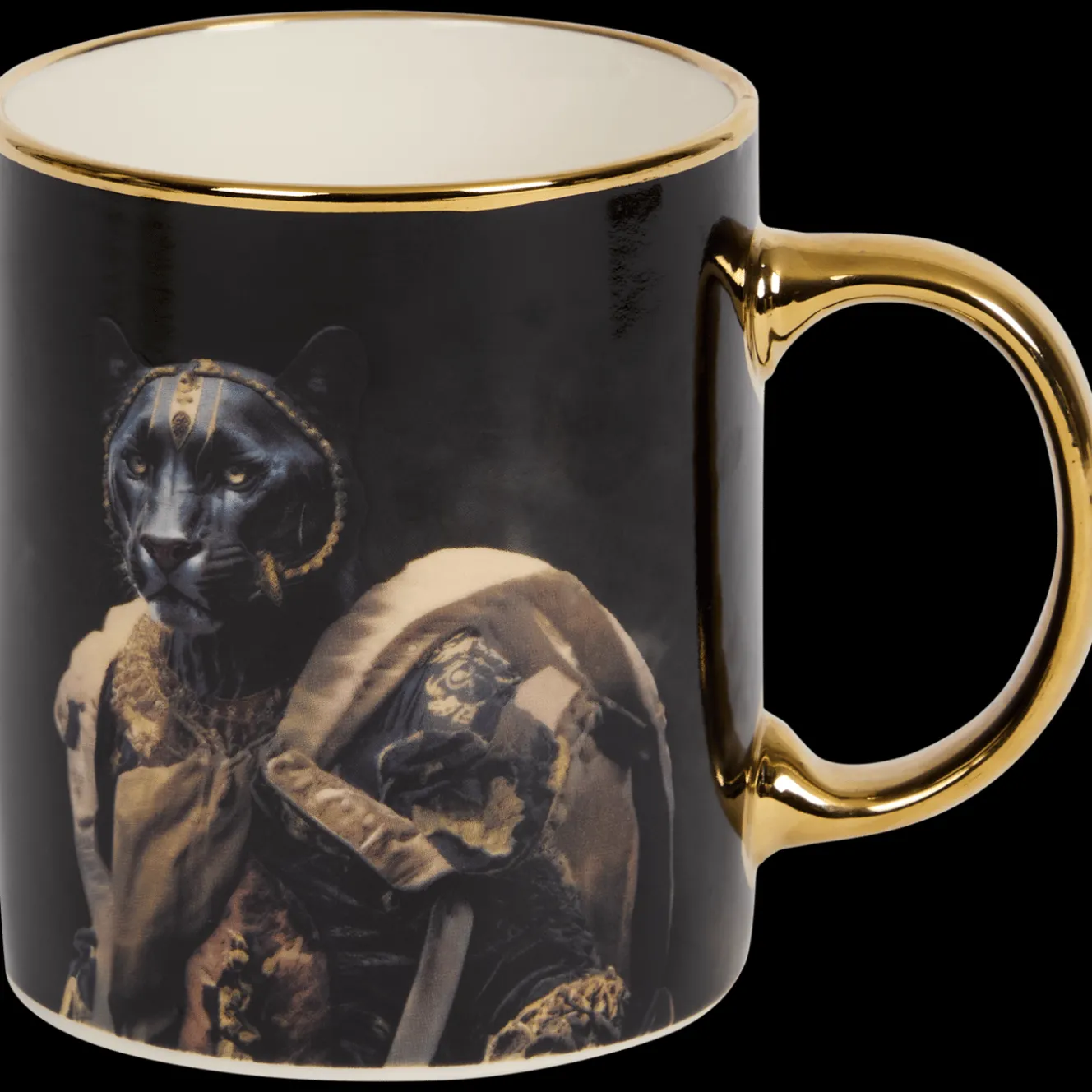 Met deze luxe mok maak je je koffie- of theemomentje nog fijner. De mok met gouden randje en oor is voorzien van een dierenportret in koninklijke stijl.