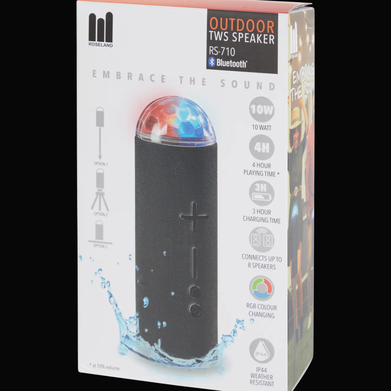 Deze toffe speaker van Roseland met RGB-ledverlichting zorgt ervoor dat je overal naar je favoriete muziek kunt luisteren. Met de bijgeleverde pinnen zet je ‘m gemakkelijk neer, waar je maar wilt. Binnen of buiten, het kan allemaal!