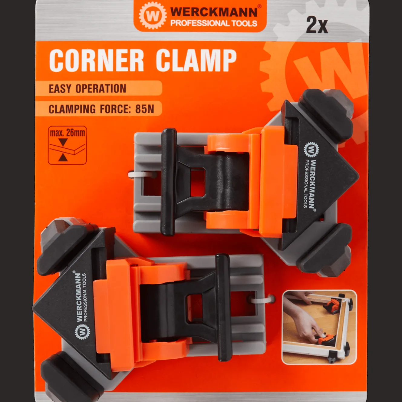 Het bevestigen van platen en lijsten in een hoek van 90° is zo voor elkaar met deze hoekklemmen van Werckmann. Schuif de plank er eenvoudig in, en gebruik beide klemmen om de 2 kanten kaarsrecht te zetten. Ideaal voor als je bijvoorbeeld een mooie houten lijst maakt of een kast bouwt. Een handig item voor iedere doe-het-zelfer.
